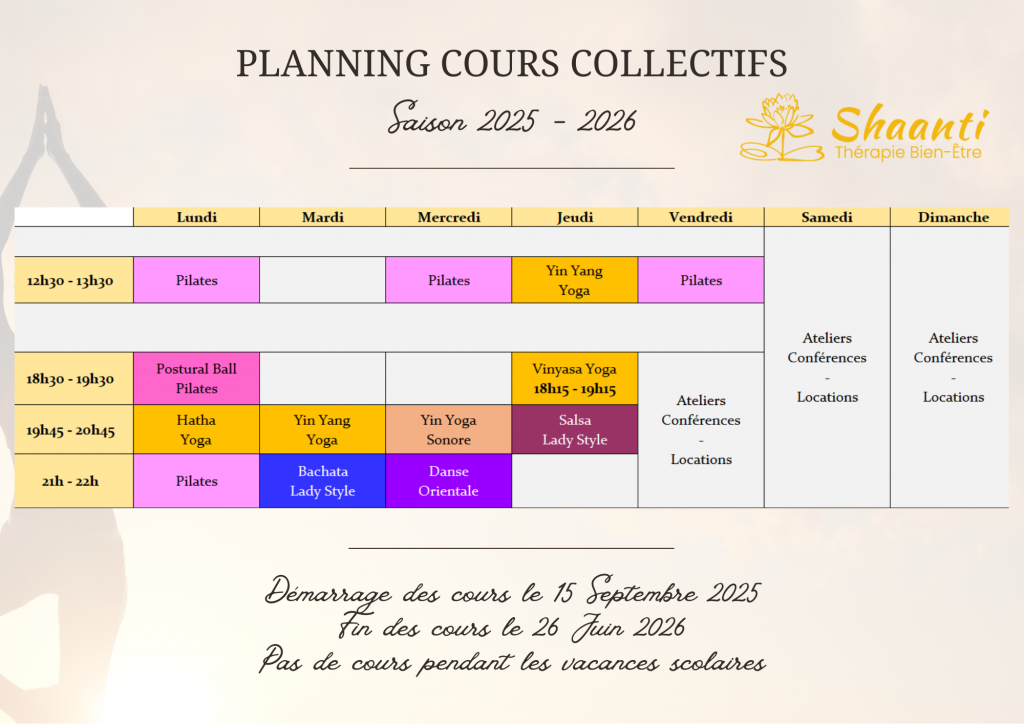 Chez Shaanti, les cours collectifs sont une invitation à vous recentrer, à prendre soin de votre corps et de votre esprit dans une ambiance bienveillante et chaleureuse. Que vous soyez à la recherche d’un moment de détente, d’un regain d’énergie ou d’une expression libre à travers le mouvement, notre offre variée vous accompagne tout au long de la semaine.